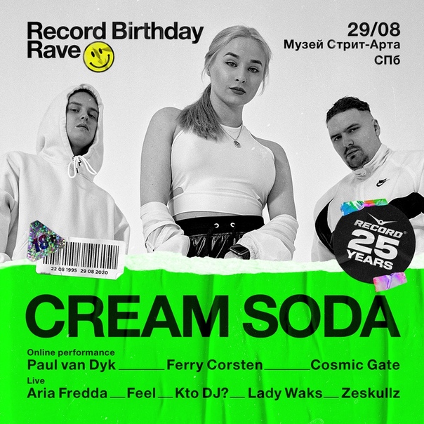 Cream Soda — специальный гость на Дне Рождения Радио Record! Авторы хитов «Никаких больше вечеринок», «Уйди, но останься», «Сердце лед» и исполнители главного кавера этого лета «Плачу на техно» знают, как заставить танцевать даже самых закоренелых скептиков. 29 августа на нашем сумасшедшем рэйве московское трио выступит с полноценным сетом и раскачает Музей стрит-арта. Не пропустите! Билеты от 1000 рублей здесь: vk.cc/aynV59
