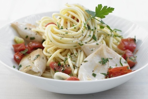 Паста с кальмарами — идеальный вкус для ценителей морепродуктов Ингредиенты:Кальмары — 500 гПоказать полностью…Красный стручок перца чили — 1 шт.Чеснок — 4 зубчикаПомидоры черри — 400 гСпагетти — 400 гСоль — по вкусуПетрушка — ? пучкаОливковое масло — 4 ст. л.Перец — по вкусуПриготовление:1. Кальмаров хорошо помыть, удалить темную пленку. Сделать несколько надрезов.2. Перец чилли разрезать на две половинки, вырезать семена и мелко порубить. Чеснок очистить и нарезать тонкими дольками, кружочками.3. Помидоры помыть, вырезать сердцевины и разрезать на четыре части. Спагетти сварить по инструкции на упаковке, в соленой воде, до состояния аль денте. Оставить немного воды, в которой варились спагетти.4. Петрушку помыть, высушить, оборвать листья и мелко порубить.5. В большой сковороде разогреть масло. Слегка обжарить в нем чеснок и перец чили, добавить кальмаров, жарить 30 секунд на сильном огне. Положить в сковороду помидоры черри, жарить еще 1–2 минуты, слегка посолить.6. Положить в сковороду спагетти, по усмотрению можно добавить воды от спагетти.7. Посыпать петрушкой, посолить, поперчить.Приятного аппетита!#горячее@bon